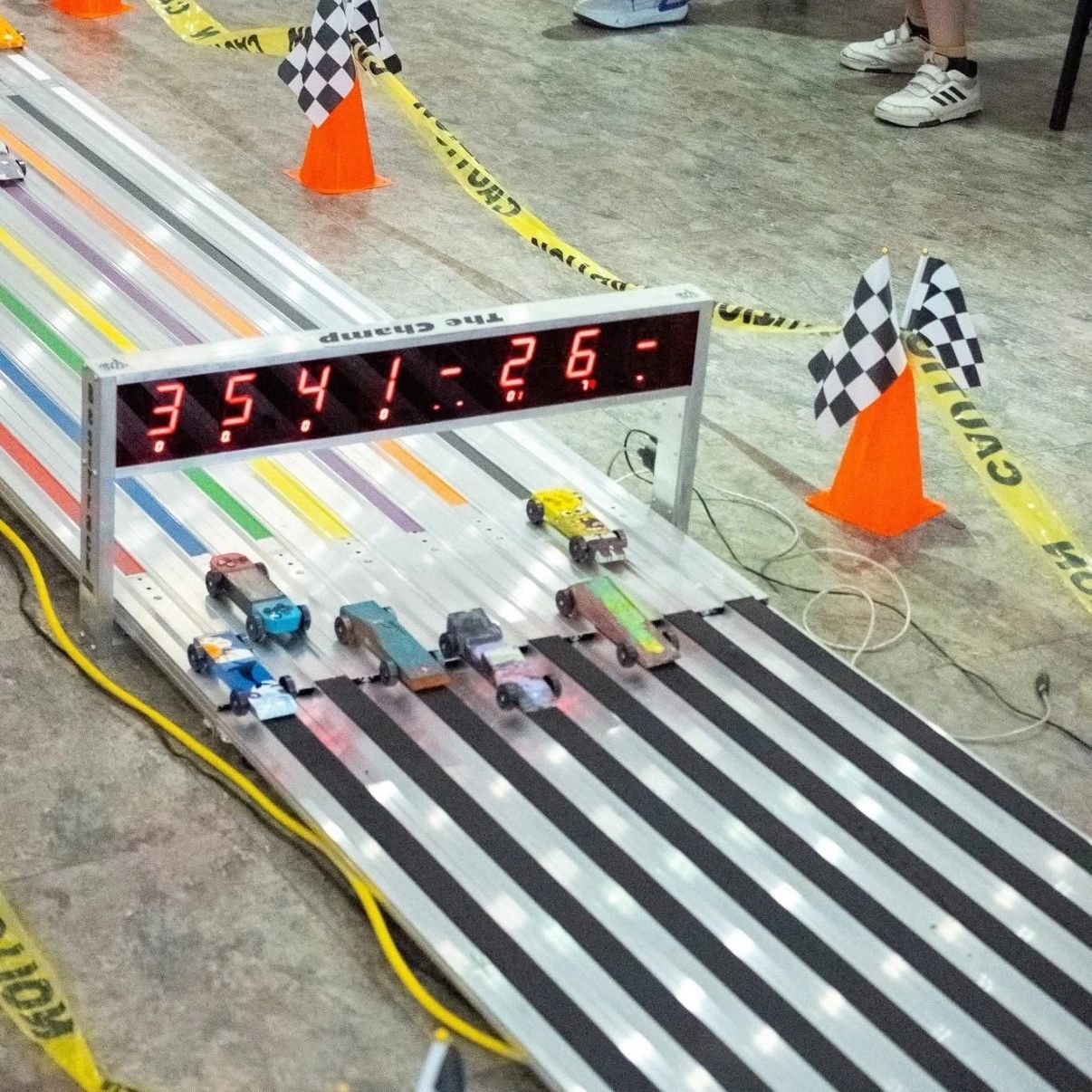 Each vehicle will race on each lane of the track once, equaling 8 total heats per vehicle, per race. The results will be calculated. The fastest time out of the 8 heats is taken for each derby car in that race time.